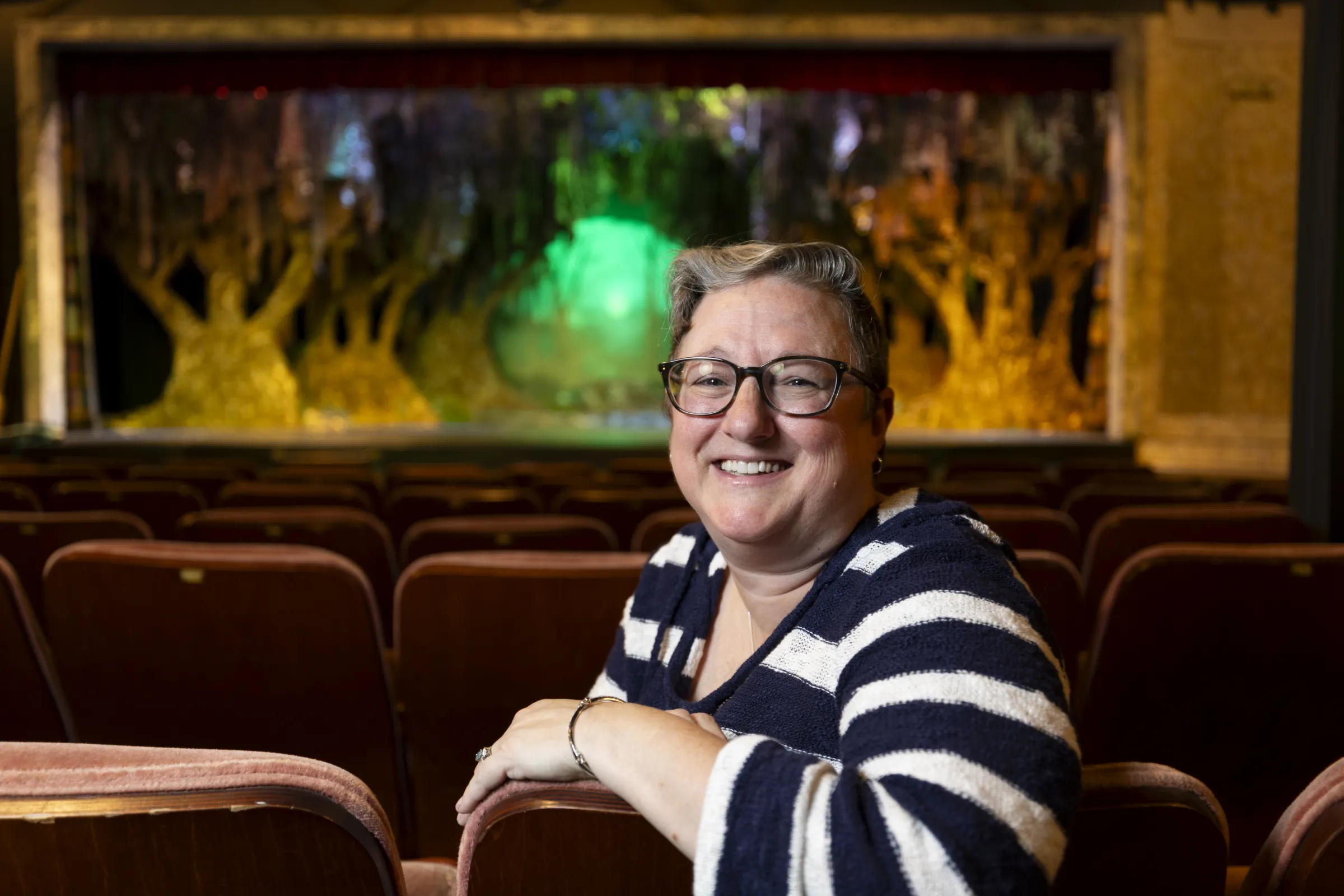 Lani Sessoms, president of the Hart County Community Theatre, sits inside the historic venue amid a renovation supported by the Archway Partnership and a Fox Theatre grant.